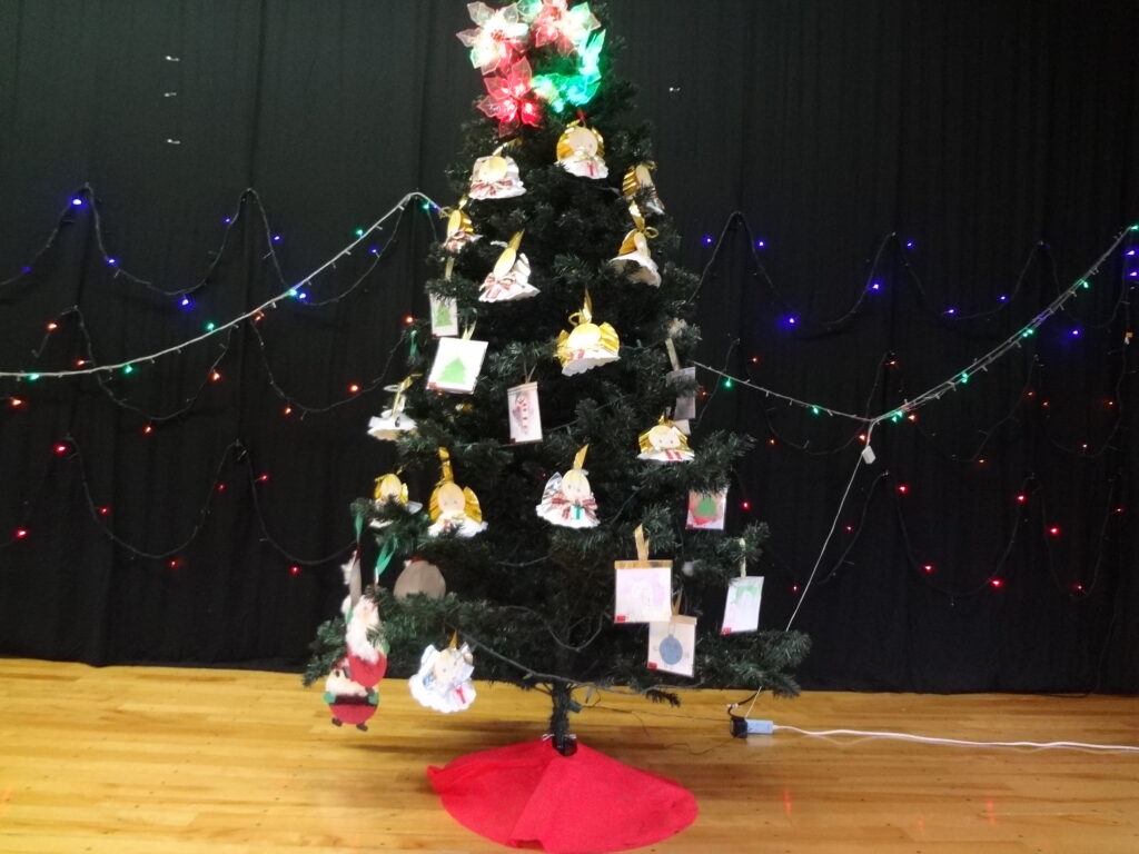 そして、ホールにある大きなツリーに飾りました。点灯時には「おー!」「きらきらしてるね★」などの声が聞こえてきました。