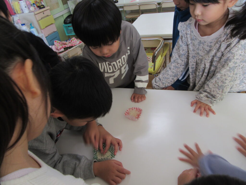 そして、もち米と蒸した後のお餅を比べて見たり、触ったり・・✨
